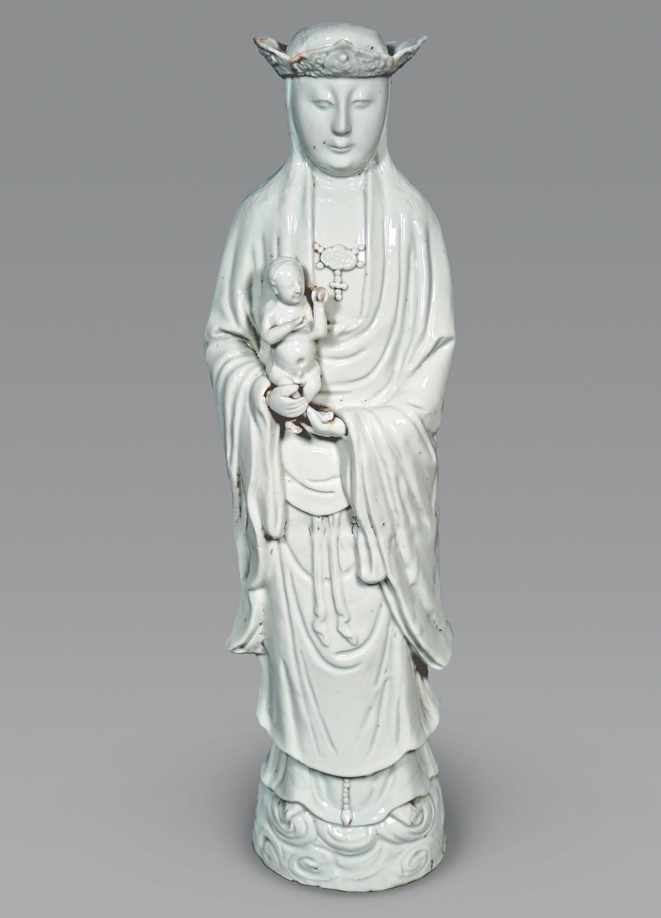 Similar examples: Koger Collection, Ringling Museum, Sarasota; Donnelly, Blanc de Chine, 1969, Pl. 122; Blumenfield, Blanc de Chine, 2002, p. 171; and Asian Civilisation Museum, Singapore, Christianity in Asia, 2016, No. 63.